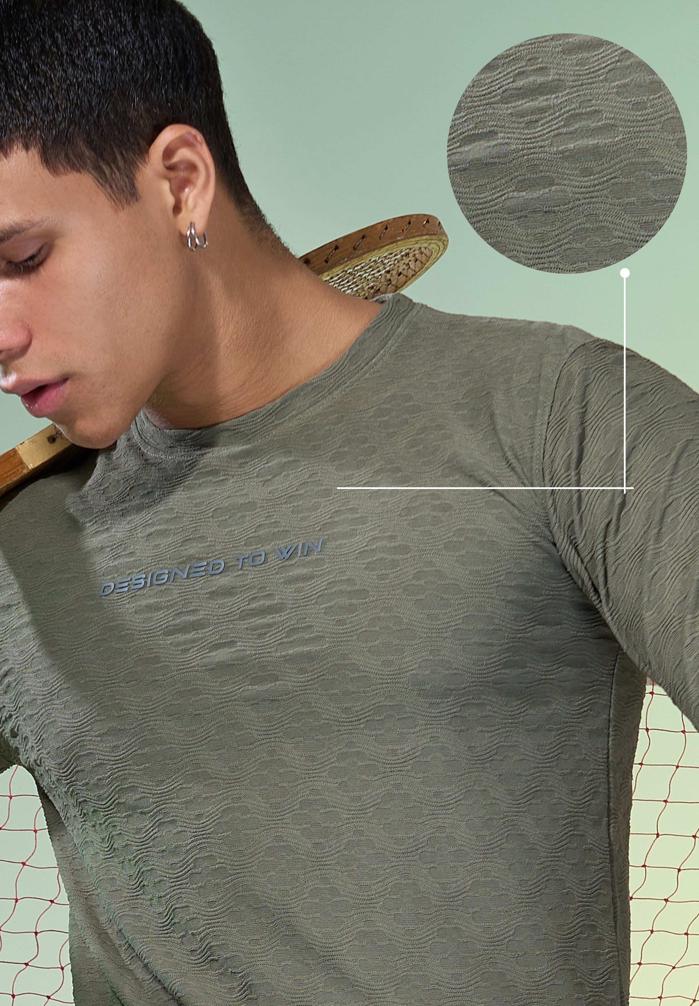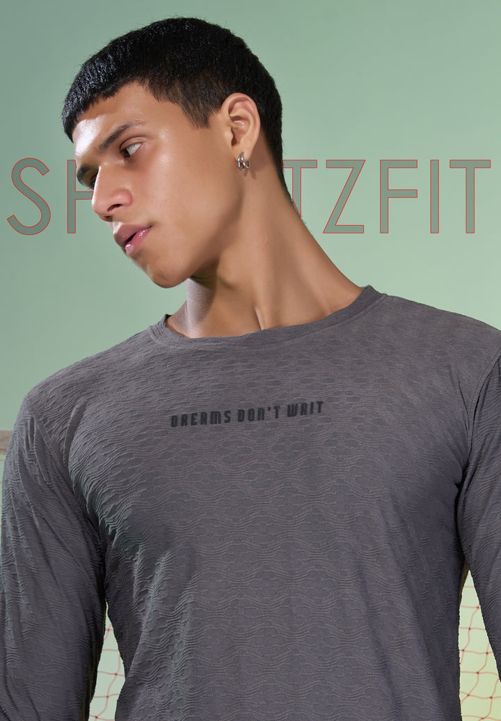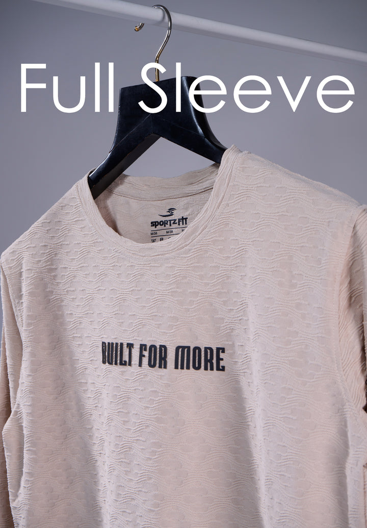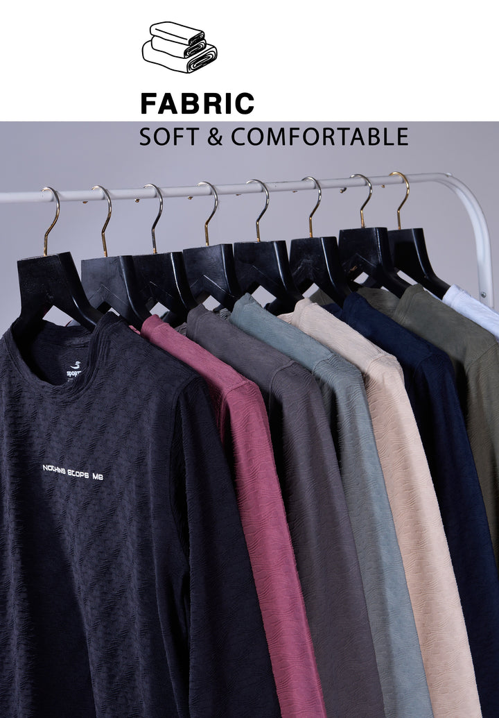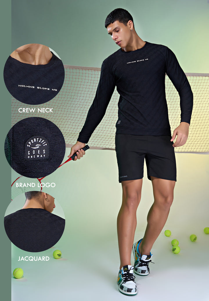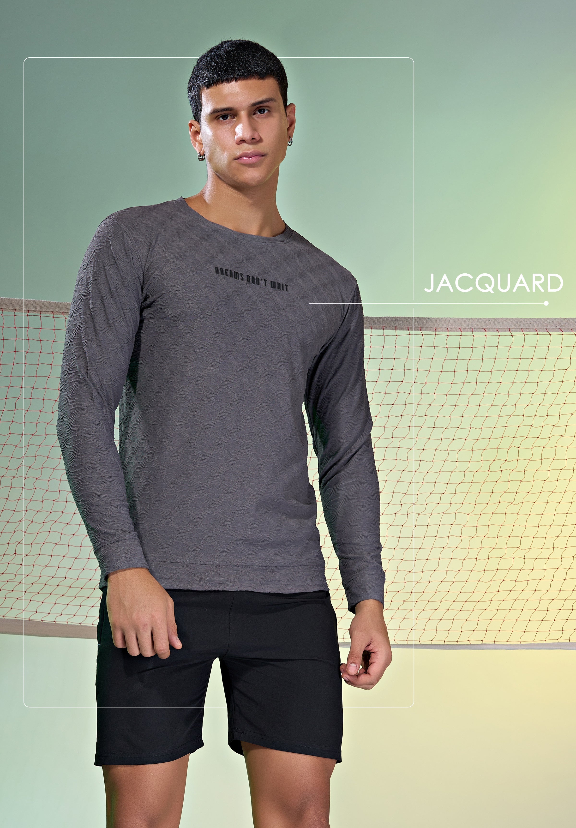 Engineered in breathable Jacquard fabric, this crew neck full-sleeve tee delivers lightweight comfort with the perfect balance of stretch and durability. Designed with an ideal GSM, it keeps you cool during workouts and warm during cooldowns. The textured pattern adds a bold, athletic touch, making it perfect for training, travel, or everyday wear.