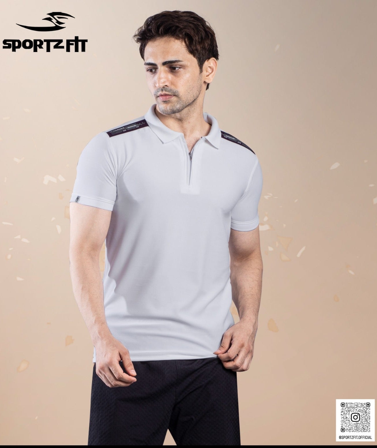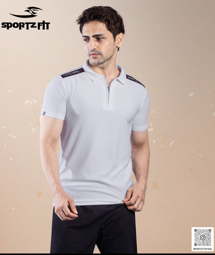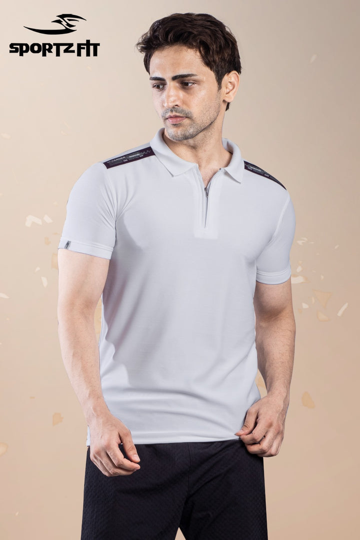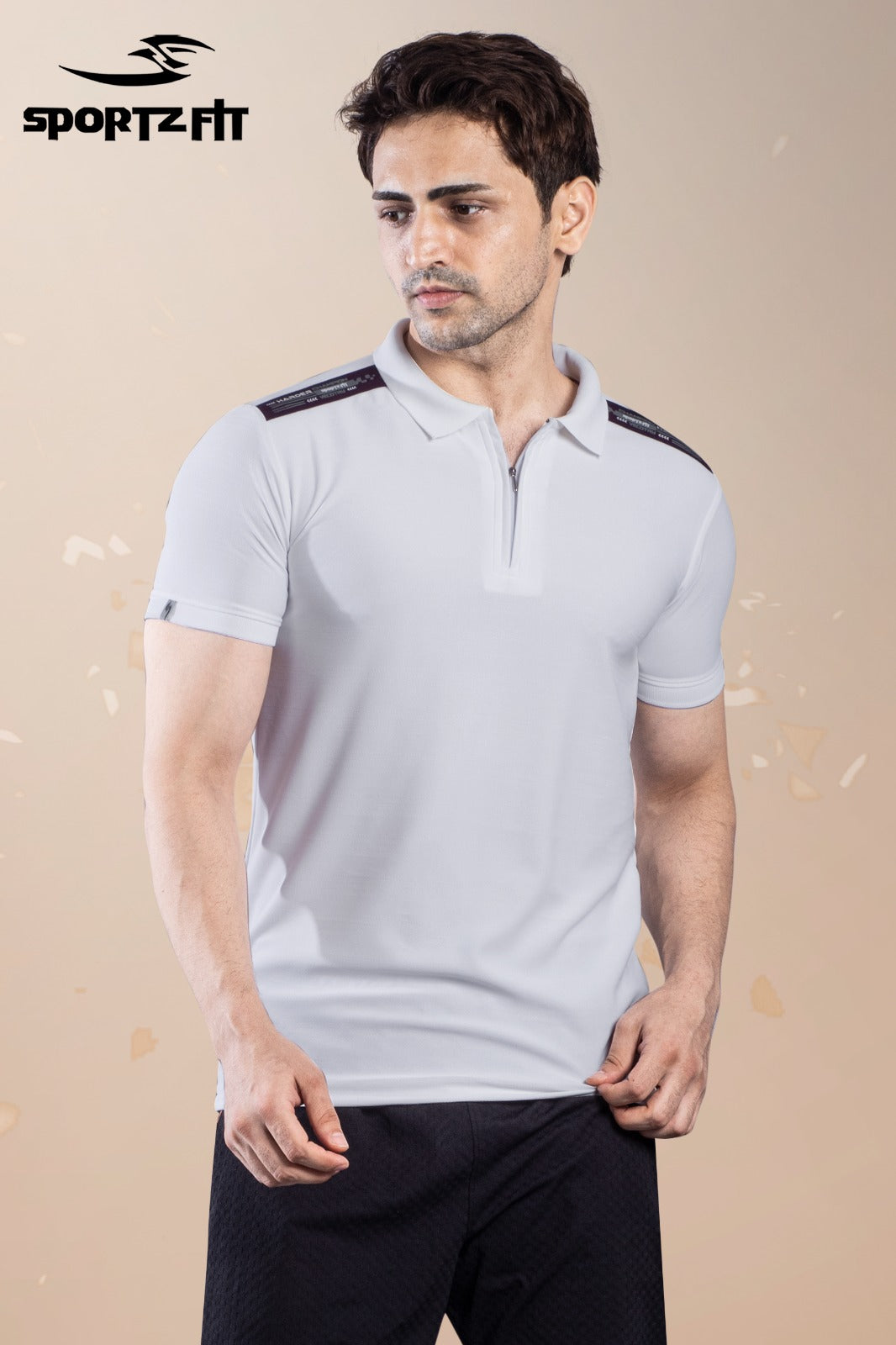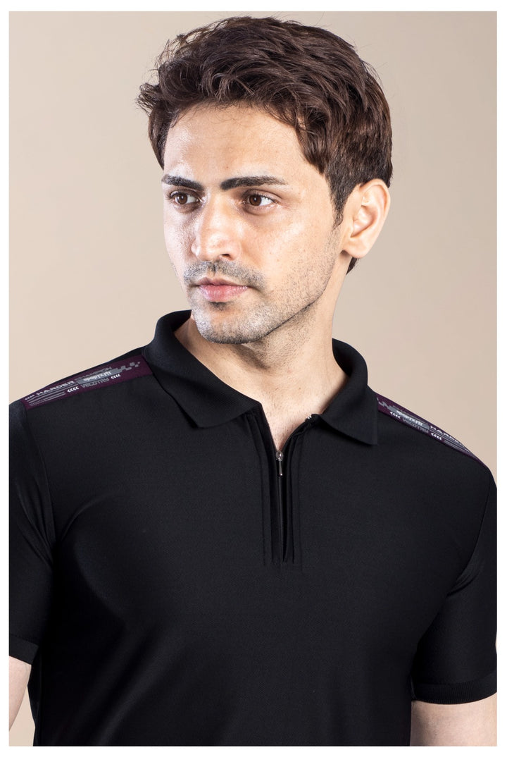 This tee features a sleek zipper closure and is crafted from textured jaquard fabric, offering subtle sophistication perfect for casual or semi-formal outings.