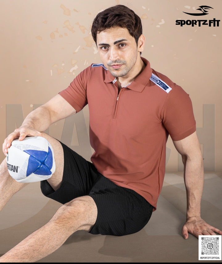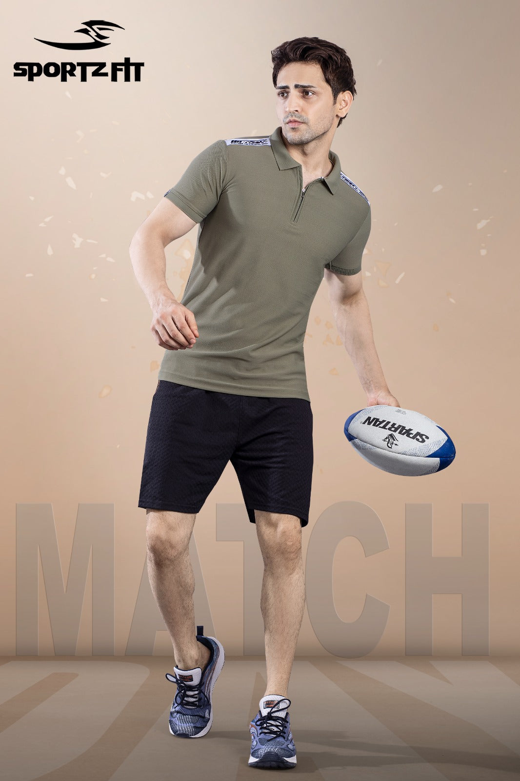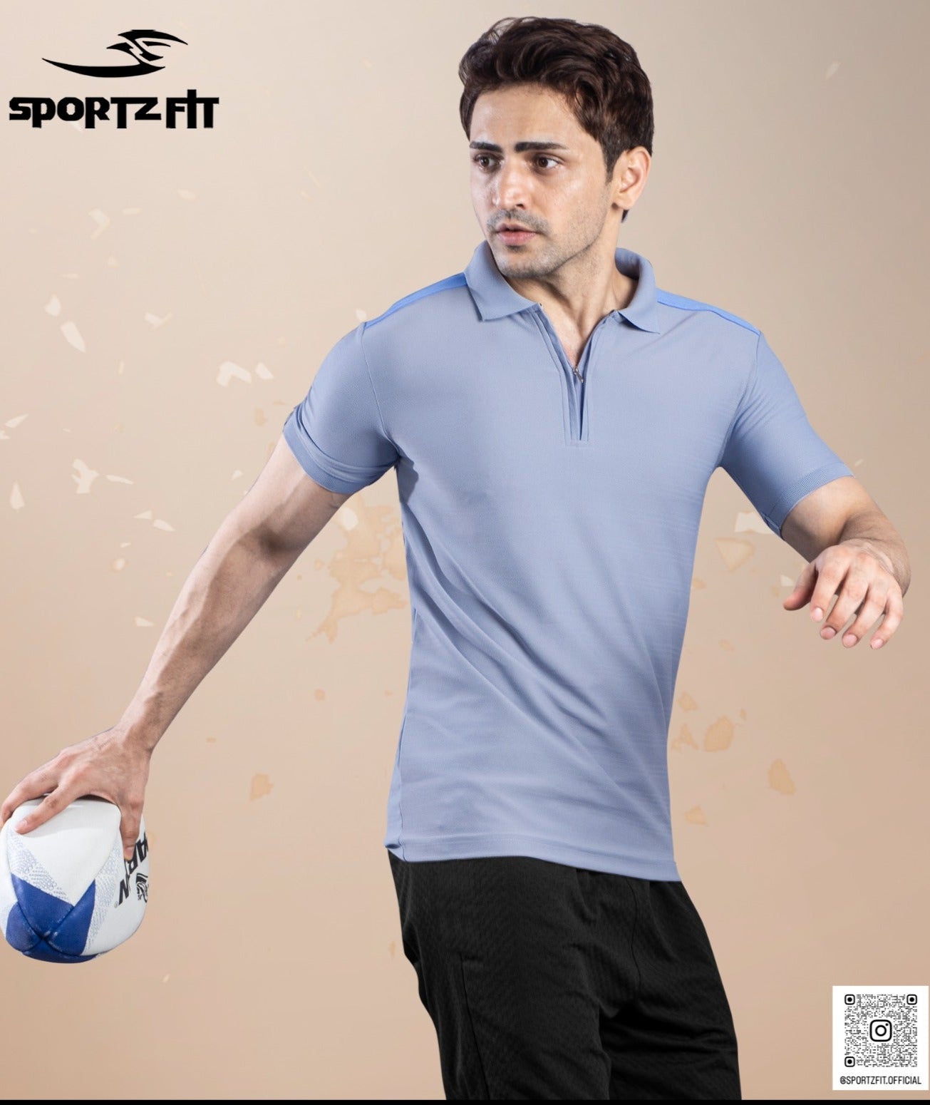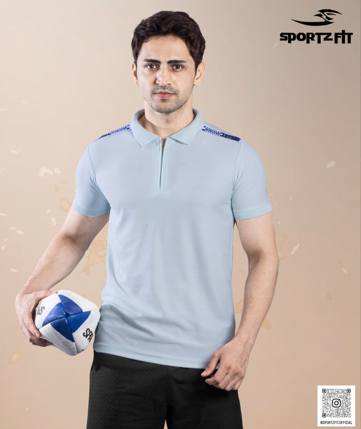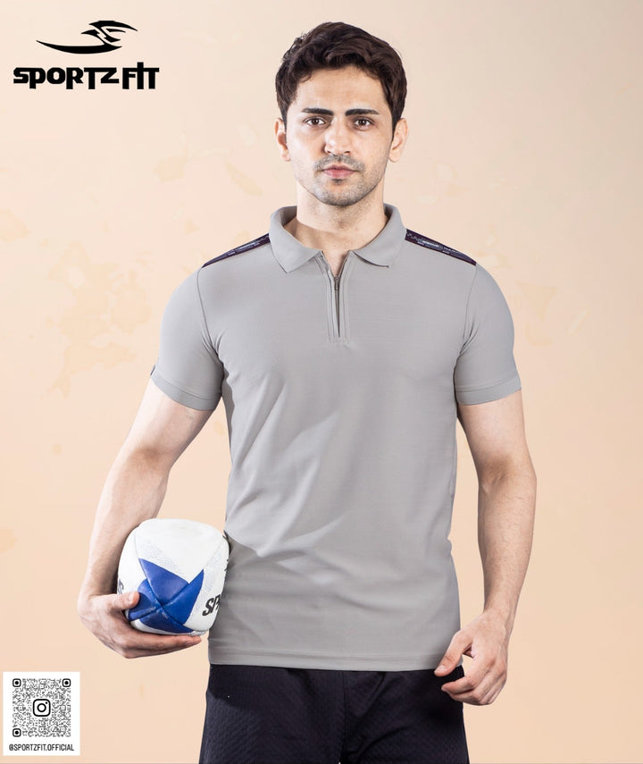 This tee features a sleek zipper closure and is crafted from textured jaquard fabric, offering subtle sophistication perfect for casual or semi-formal outings.